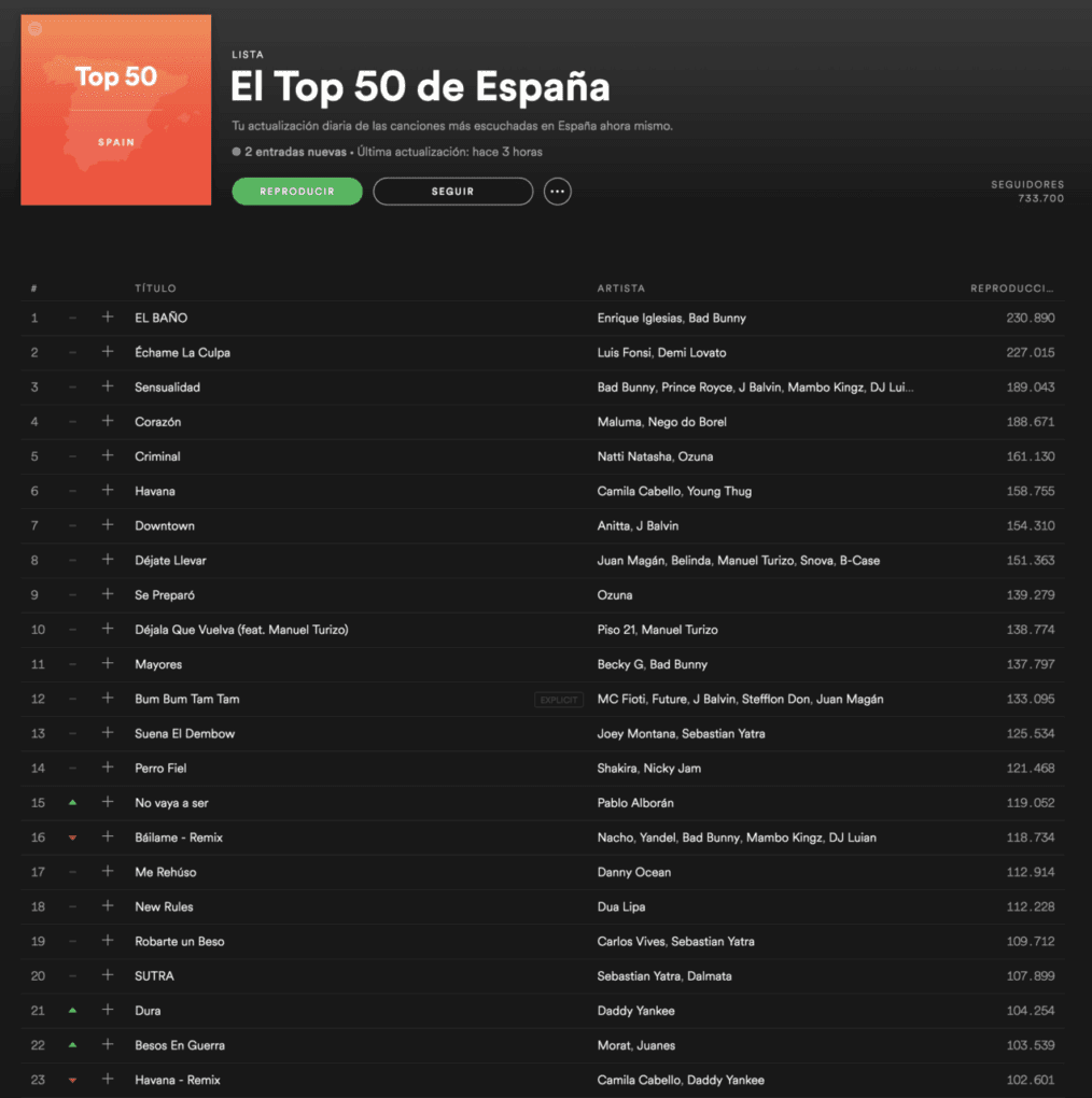 Un vistazo a Spotify nos aboca a una retahíla de nombres que triunfan en el mundo del pop latino, el reggaeton y el pop nacional. Maluma, Luis Fonsi, Prince Royce, Pablo Alborán, Carlos Vives, Danny Ocean, Nicky Jam, Joey Montana, Piso 21, Juan Magán, Sebastián Yatra, Ozuna, Bad Bunny… todos ellos artistas pertenecientes a los géneros mencionados, capaces de cosechar millones de reproducciones a nivel mundial en espacios relativamente breves en el tiempo. Por poner tan solo un ejemplo, el dueto “Échame la Culpa” de Luis Fonsi con Demi Lovato acumula más de dos millones y medio de reproducciones en Spotify dentro del Top50 Global, que se calcula a lo largo de los últimos días. La canción, en global, lleva acumuladas más de 169.000.000 de escuchas. “Despacito”, en la versión dueto con Justin Bieber, acumula unos nada desdeñables 993.000.000 de reproducciones a nivel mundial. Cifras de alcance absolutamente impensable hace tan solo unos años, cuando un artista exitoso podía vender 15 o 20 millones de discos en todo el mundo en un espacio razonable de varios años. Llegar a casi mil millones de personas en el espacio de menos de un año tiene un efecto prácticamente incalculable, no solo en lo económico, sino en la influencia social y en todo tipo de estrategias comerciales derivadas.