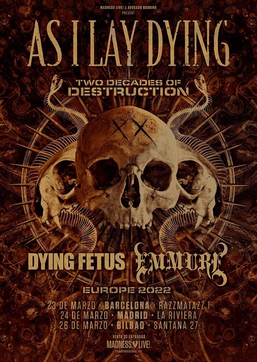 La promotora Madness Live! ha anunciado que As I Lay Dying estará en España como parte de su tour «Two decades of destruction» en tres conciertos en Barcelona, Madrid y Bilbao en los que estarán acompañados por Dying Fetus y Emmure.