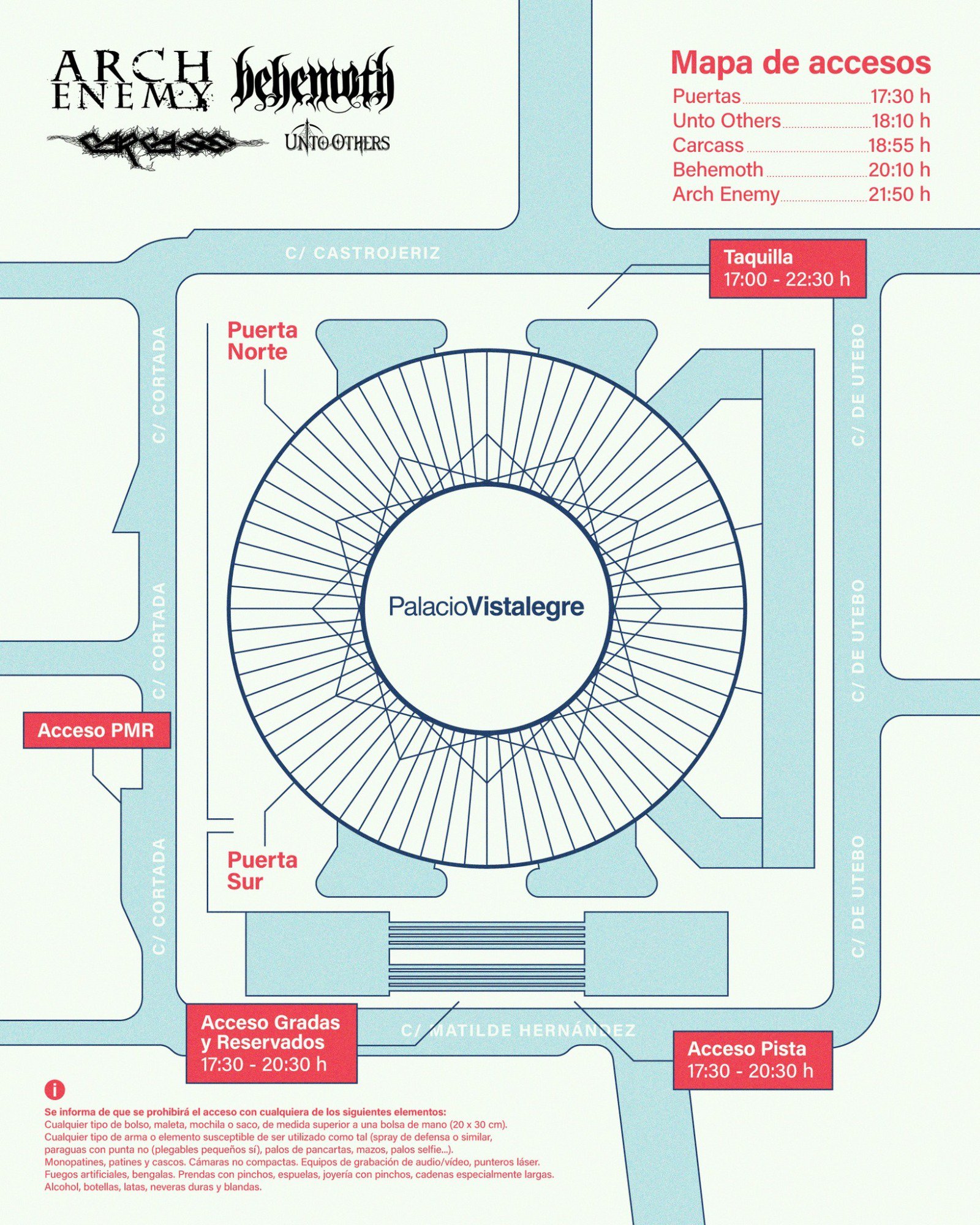 El cartel lo completan Unto The Others para dos fechas de las más potentes de música metal en nuestro país en lo que resta de 2022. El setlist de las bandas puedes encontrarlo aquí, mientras que las entradas para ambos shows están disponibles a través de este enlace. A continuación, estos son los horarios de Arch Enemy, Behemoth y Carcass en Madrid y Barcelona: