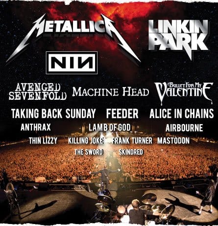 FEEDER, TAKING BACK SUNDAY, SKINDRED y FRANK TURNER han sido las nuevas incorporaciones para el festival Sonisphere encabezado por METALLICA en U.K. Se celebrará los días 1 y 2 de Agosto en el mítico Knebworth Park.