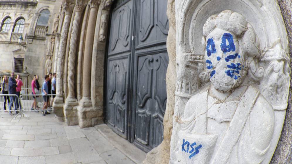 Una escultura del siglo XII de la fachada románica de Praterías de la Catedral de Santiago de Compostela, fue pintada con la palabra de la banda Kiss y emulando el rostro del alter ego del batería Eric Singer (anteriormente fue Peter Criss).