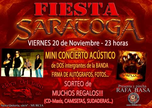 El próximo viernes 20 de Noviembre, habrá una fiesta SARATOGA a partir de las 23 horas en la Boca del Lobo (Murcia).