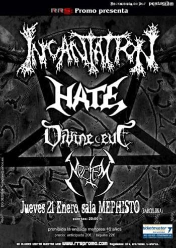 Una de las primeras descargas de Metal extremo del año es este pack compuesto por los míticos Incantation, una de las bandas pioneras del Death Metal neoyorkino junto a Suffocation e Immolation. Vuelven a España tras años de ausencia de los escenarios españoles, con 8 discos de estudio, 2 en directo y varios EPs y singles Incantation es una de las bandas de Death Metal más respetadas de la escena. Junto a los americanos estarán los polacos Hate, una banda con 20 años de existencia y con 6 discos editados hasta la fecha, junto a Vader y Behemoth una de las bandas más solidas de la escena polaca de Death Metal. La tercera banda son los también americanos Divine Eve, una banda de culto de Doom Death Metal que tras mas de 12 años de su separación vuelven a los escenarios recalando por primera vez en España. La banda que abrirá los conciertos son los valencianos Noctem.